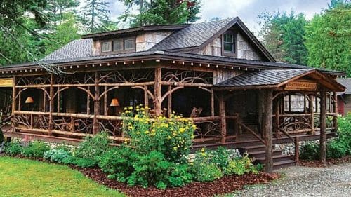 “Naturally bent branches or curving willow were often used as railings or trim for porches in the Adirondacks. Swiss chalet style surfaces on larger Great Camps, with the addition of overhanging balconies and gingerbread trim. Log posts and beams with bark intact fit perfectly with the style.”